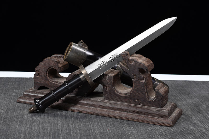 全長:34CM 刃長: 19.4CM 柄長:10CM 劍身: 百煉花紋鋼刀鞘:黑檀木裝具:手工包銅銅黑包裝:錦盒