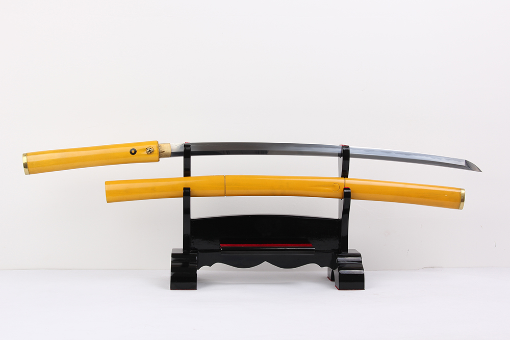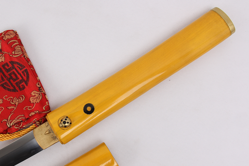 28寸七星瓢蟲高檔手工刀全長:104cm 刃長:68cm 柄長:28cm刃材:1095鋼燒刃無槽三色大頭柄材:實木本色帶黃鞘材:實木本色帶黃配件:銅包裝:黑紙木盒裝帶銀角外加雙瓦紙盒裝 帶盒裝玉刀油銅錘 藍色梅竹真絲刀袋 西班牙單層亮光刀架不印字貼紅布 黑說明書