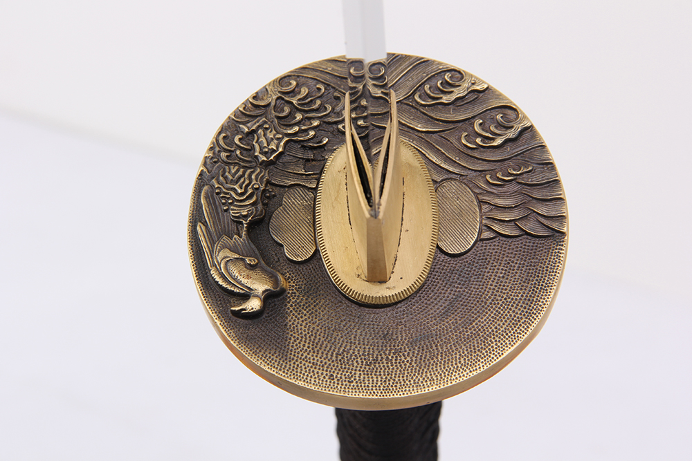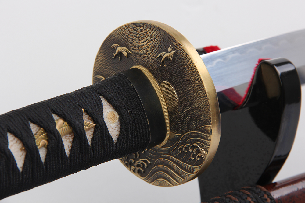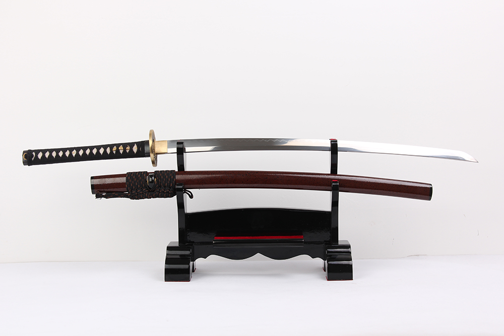 28寸高檔手工刀全長:104cm 刃長:68cm 柄長:28cm刃材:1095鋼燒刃無槽有切線大頭柄材:實木 繞黑色帶+真魚皮鞘材:實木深咖啡黑點殼三個黃牛角 繞好黑+咖啡真絲帶配件:銅包裝:梧桐木盒外加雙瓦紙盒裝 帶盒裝玉刀油銅錘 黑色梅花真絲刀袋 西班牙單層亮光刀架不印字貼紅布 黑說明書