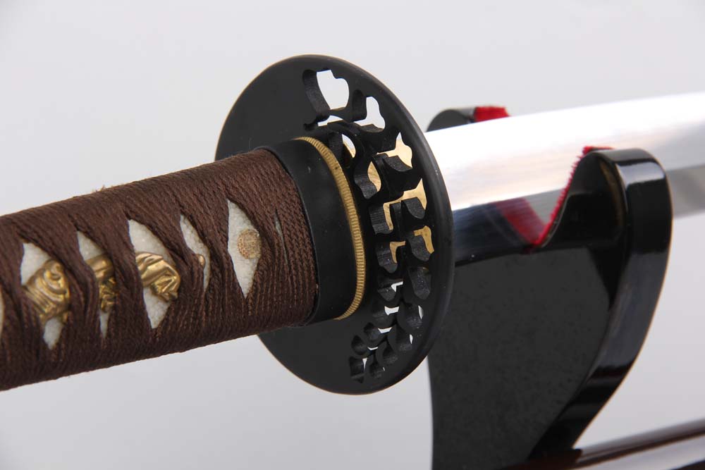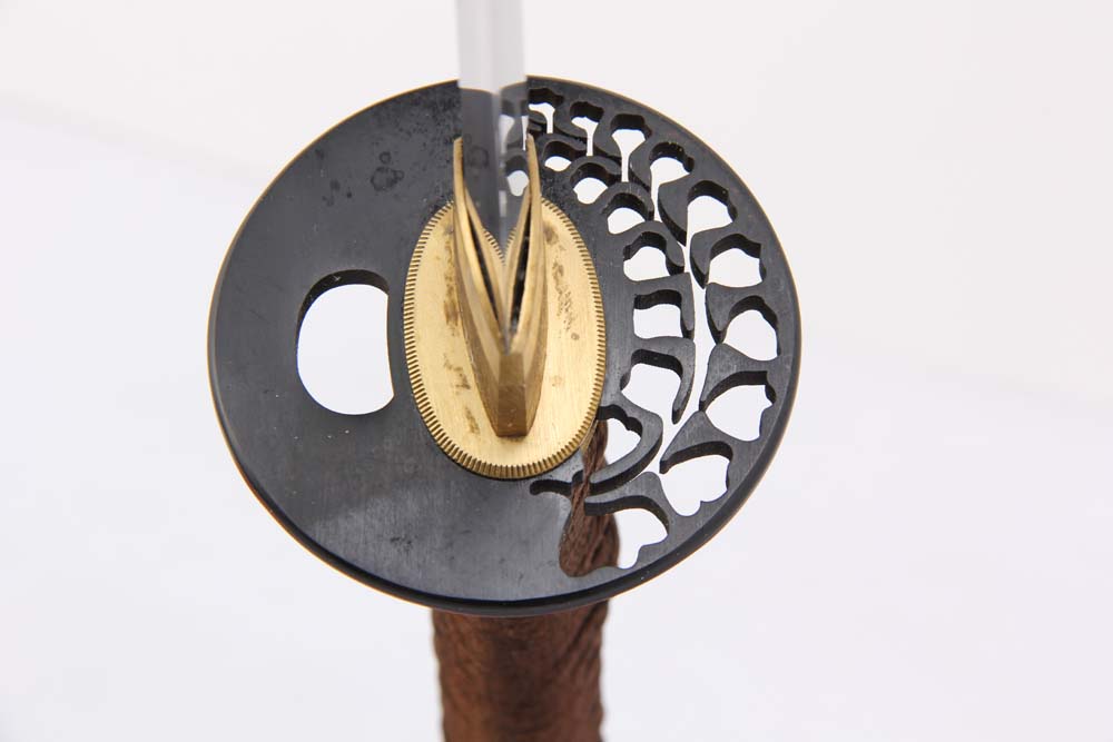 鞘材:實(shí)木深咖啡漆三個(gè)黃牛角 繞咖啡真絲帶