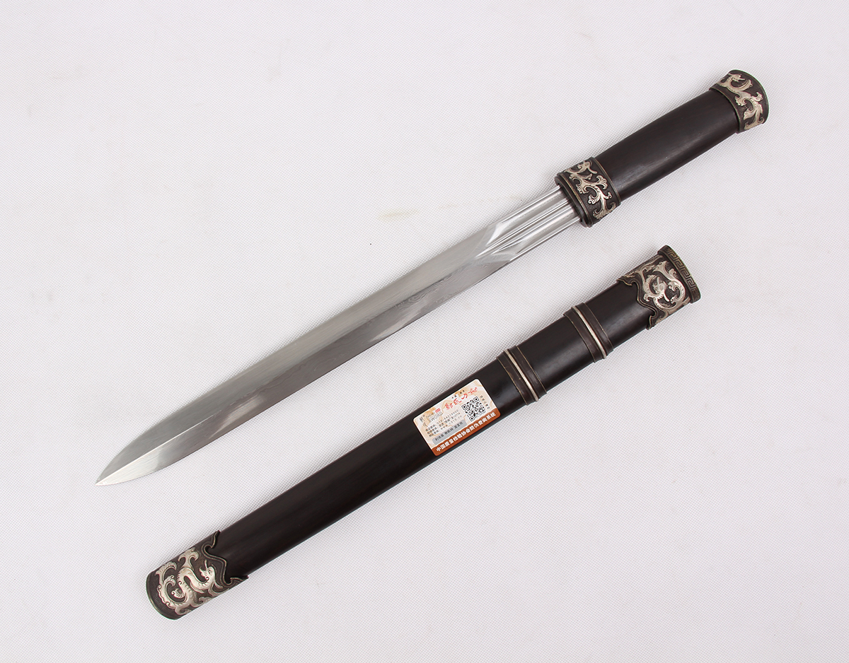 全長: 55CM 刃長: 36CM 柄長:15CM 劍身: 百煉花紋鋼刀鞘:黑檀木裝具:銅鎏銀包裝:錦盒