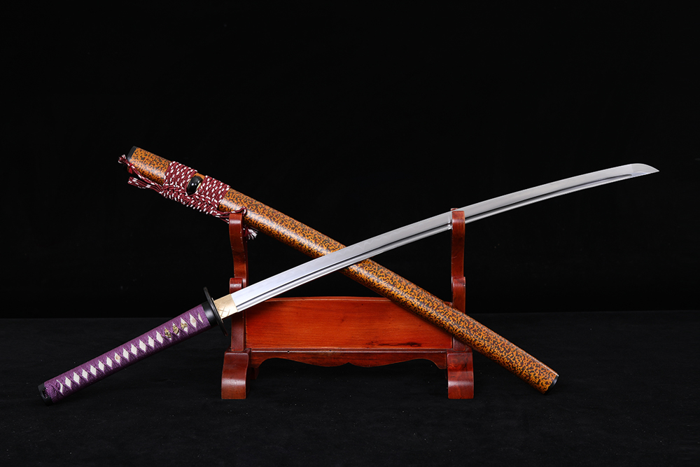 28寸高檔手工刀全長:104cm 刃長:68cm 柄長:28cm刃材:1045鋼燒刃全槽有切線柄材:實(shí)木 繞紫色帶+真魚皮鞘材:實(shí)木紅黃黑三色點(diǎn)三圈黑 繞棗紅間白真絲帶配件:銅包裝:黑龍布木盒裝帶黑布袋
