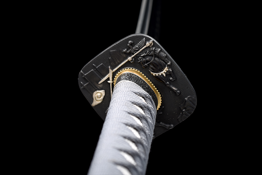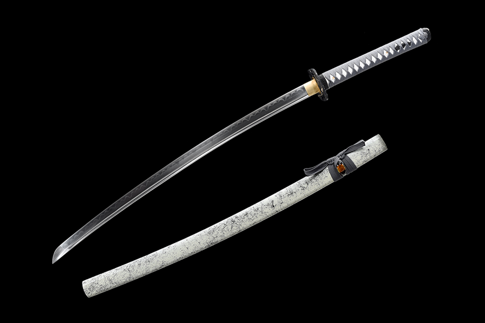 28寸手工刀全長:104cm 刃長:68cm 柄長:28cm刃材:1045鋼燒刃全槽有切線柄材:實木 繞灰色帶 +仿魚皮鞘材:實木白色拉黑絲水晶鼻 繞灰色帶 配件:銅+鋅合金包裝:紙盒裝,帶黑布袋