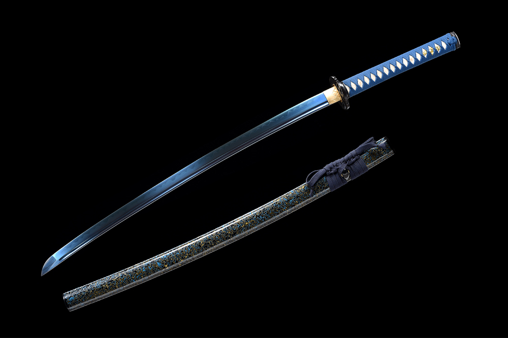 28寸手工刀全長:104cm 刃長:68cm 柄長:28cm刃材:1045鋼燒刃烤藍全槽有花口有切線柄材:實木 繞藍色帶+真魚皮鞘材:實木藍底金秀三圈黑 繞深藍色羊毛帶配件:銅+鋅合金包裝:紙盒裝,帶黑布袋