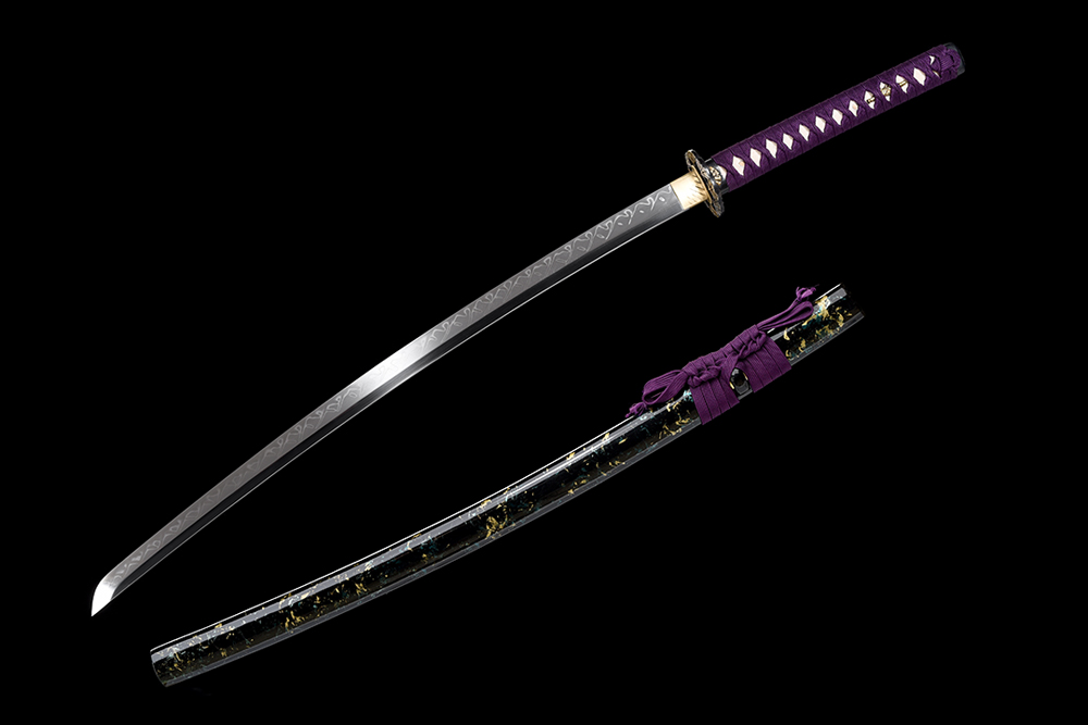 28寸手工刀全長:104cm 刃長:68cm 柄長:28cm刃材:1095鋼燒刃釘子紋無槽有切線柄材:實木 繞紫色帶+真魚皮鞘材:實木黑底金加綠花亮光 繞紫色羊毛帶配件:銅包裝:雙瓦紙盒配件:銅+鋅合金包裝:雙瓦紙盒