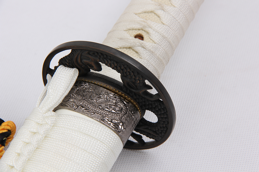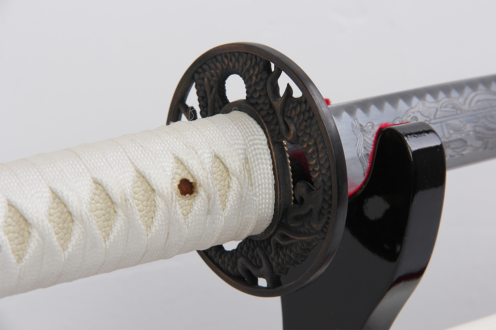 28寸手工刀全長:104cm 刃長:68cm 柄長:28cm刃材:1045鋼無槽做小花口有切線 正面爛法師反面爛劍柄材:實木 繞白色帶+仿魚皮鞘材:實木亮白殼無鼻子 繞白色帶配件:鋅合金包裝:黑彩盒