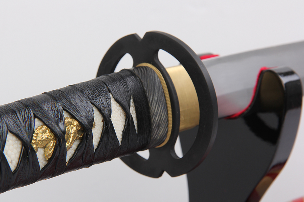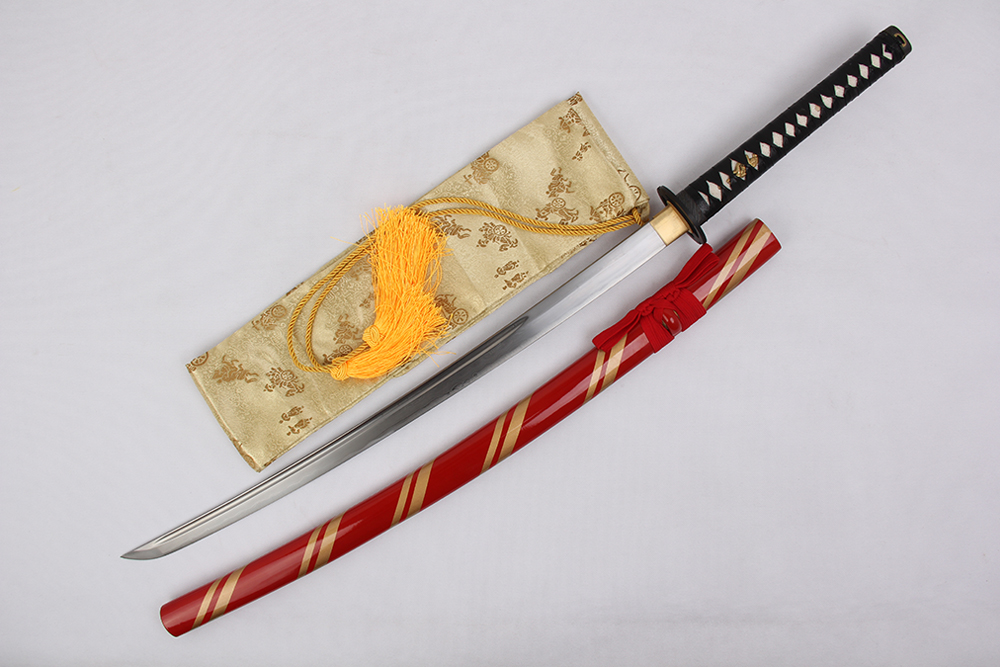 28寸手工刀全長:104cm 刃長:68cm 柄長:28cm刃材:百煉花紋鋼全磨有血槽無花口無切線柄材:實木 繞黑豬皮+真魚皮鞘材:實木大紅殼繞雙線 繞大紅色帶配件:銅+鋅合金包裝:黑彩盒裝 帶紅色菊花真絲刀袋