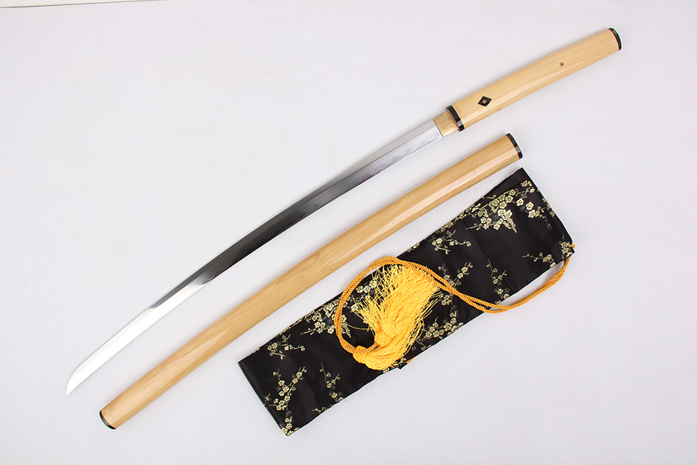 28寸高檔逆刃手工刀 全木形全長(zhǎng):104cm 刃長(zhǎng):68cm 柄長(zhǎng):28cm刃材:1095鋼燒刃無(wú)槽三色柄材:白芋本色鞘材:白芋本色四圈黑牛角帶菱形片配件:銅包裝:黑彩盒 帶紅色菊花真絲袋