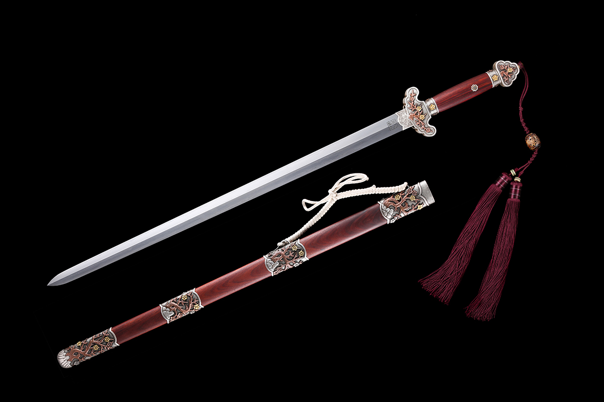 “寶劍鋒從磨礪出,梅花香自苦寒來”。此劍,是以上等花紋鋼、紫銅,天然蛇紋木、魚皮等為材料,取樣清劍風(fēng)貌,采用傳統(tǒng)手工技藝,歷鍛、鏟、銼、刻、磨……等28道工序精制而成。全長105厘米,柄長23 厘米,刃長76 厘米,刃寬3.5厘米,重量2.2千克。劍身,以錨鐵夾鋼經(jīng)百煉鍛造后,鍔成鋒銳,剛?cè)岵⒃?,寒光逼人,其劍面四向錯落有致、蜿蜒如練的流水紋,似四灣溪水從劍格處直瀉劍尖,靈動出巧,妙趣天成。其如意形劍格、葫蘆式劍首、橢圓徑長狀劍鞘上以50余克黃金、600余克白銀浮雕梅花如星辰般布列裝飾,意蘊著花開富貴喜盈門,事業(yè)昌盛財源旺之福祿如意景觀,使整劍于婉約典雅中見端莊大氣,于豪放恢宏間彰顯人文與自然兩相宜之富麗高貴氣象。