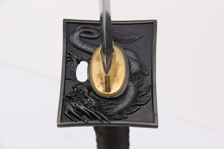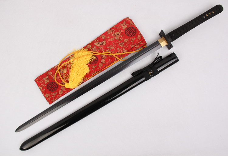 28寸手工劍 直款全長:104cm 刃長:68cm 柄長:28cm刃材:百煉花紋鋼發(fā)黑開單支血槽無花口柄材:實木 繞黑色帶+真魚皮鞘材:實木黑亮光漆 繞黑色帶配件:銅+鋅合金包裝:黑彩盒 帶黑布袋