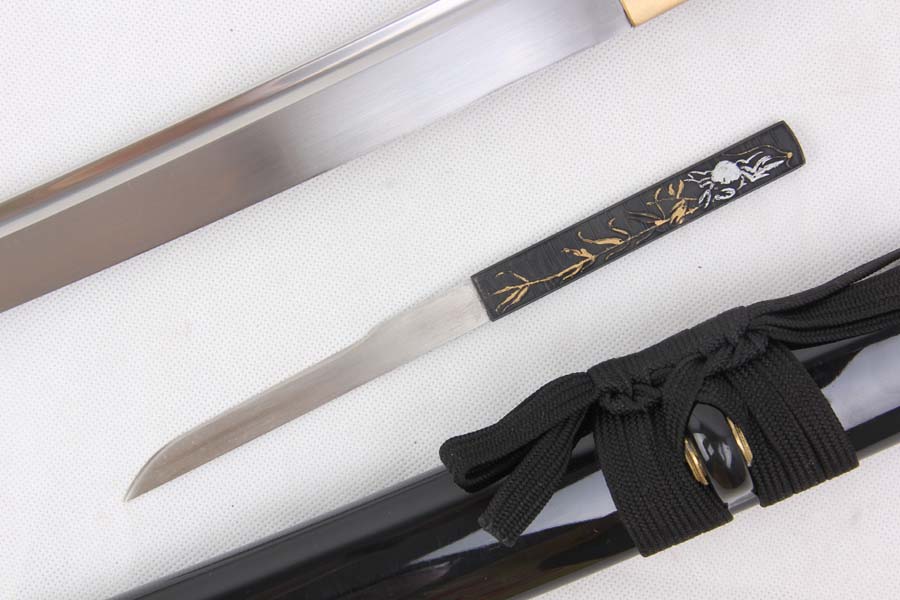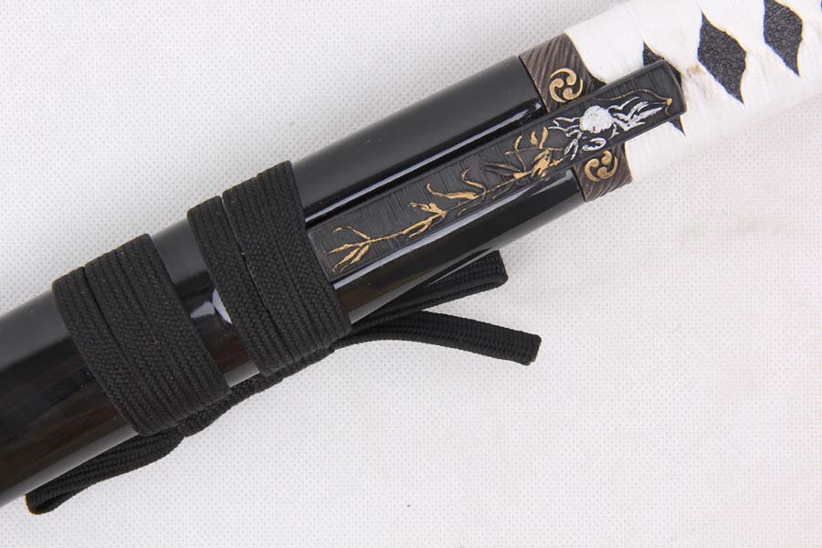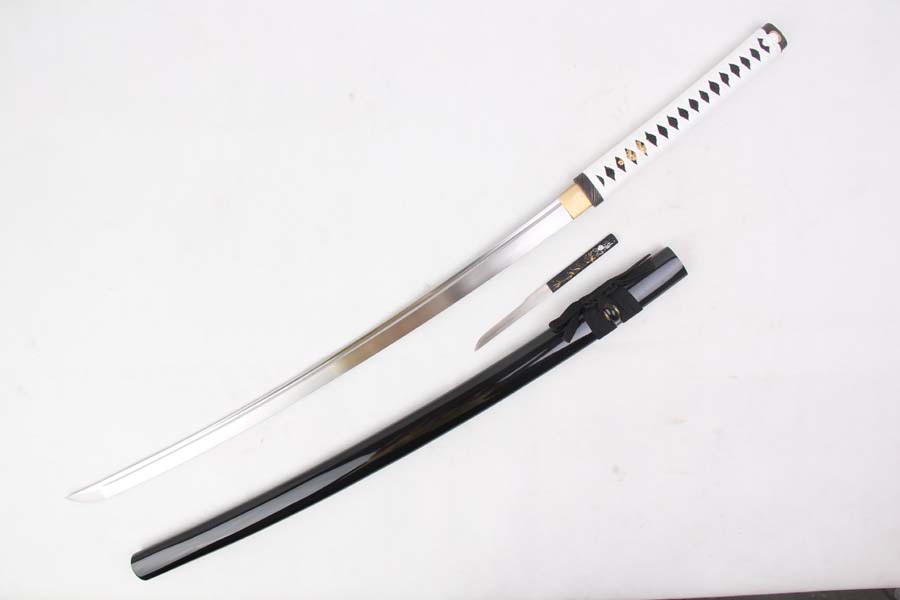 28寸手工刀全長:104cm 刃長:68cm 柄長:28cm刃材:1045鋼無槽有花口 腹刀不銹鋼柄材:實木 繞白色帶+真魚皮鞘材:實木黑亮光帶腹刀插槽 繞黑色帶配件:銅+鋅合金包裝:黑彩盒裝 帶黑布
