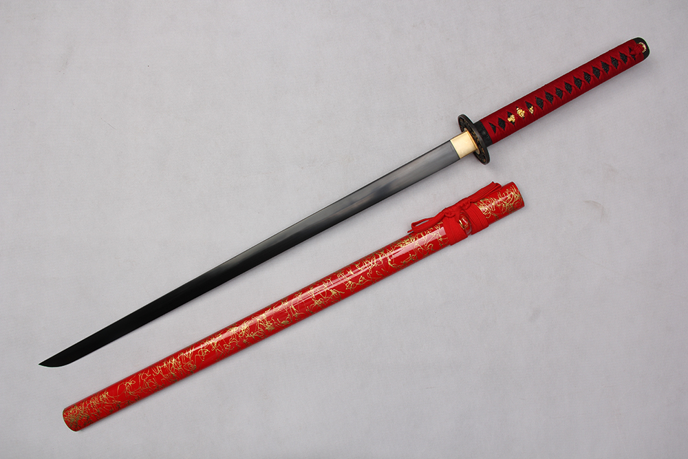 28寸手工刀直款全長:104cm 刃長:68cm 柄長:28cm刃材:1045鋼發(fā)黑柄材:實木 繞玖紅帶+仿魚皮鞘材:實木大紅拉金絲 繞玖紅帶配件:鋅合金包裝:雙瓦紙盒
