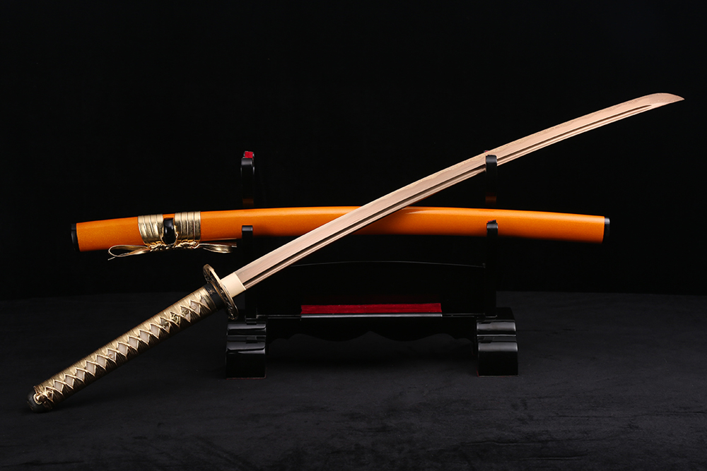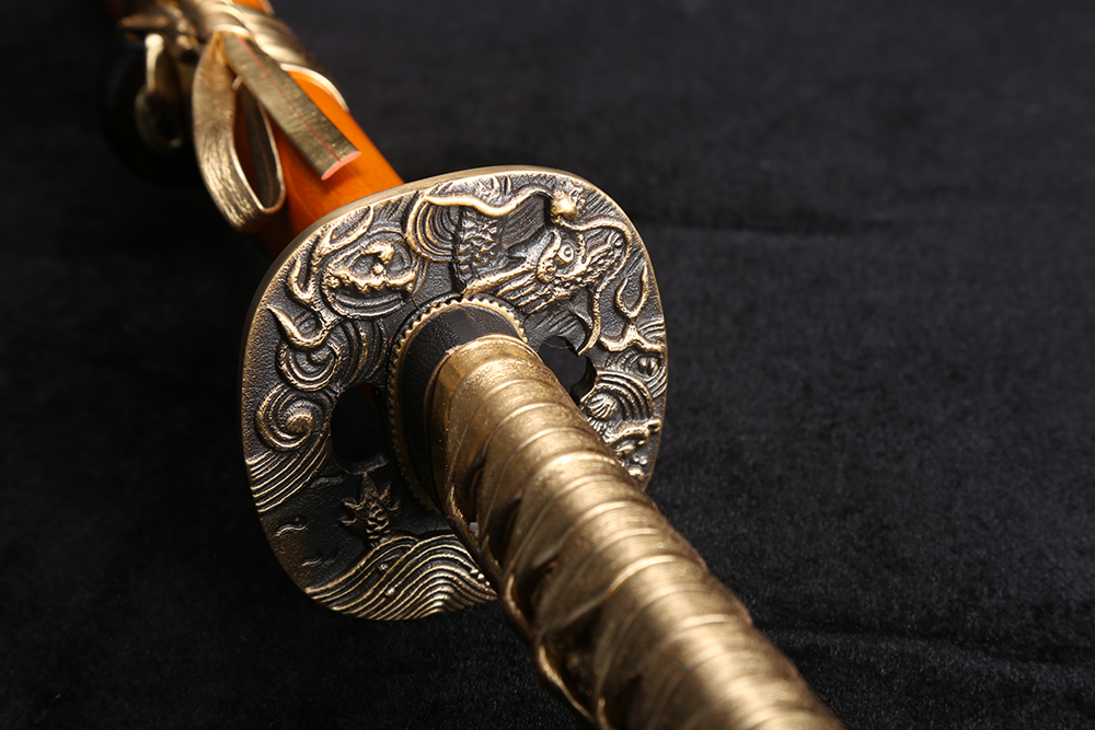 28寸手工刀全長(zhǎng):104cm 刃長(zhǎng):68cm 柄長(zhǎng):28cm刃材:百煉花紋鋼全槽電鍍金黃色有花口有切線柄材:實(shí)木 繞金色假皮+真魚皮鞘材:實(shí)木閃光金黃鞘三圈黑 繞金色假皮配件:銅包裝:彩盒裝 帶黑布袋