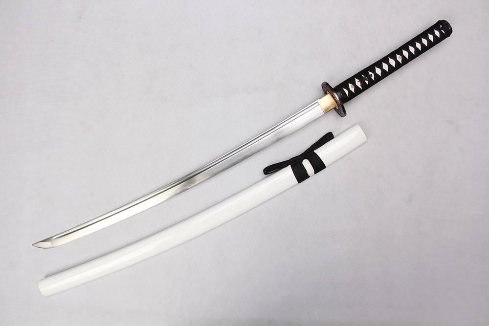 28寸手工刀全長:104cm 刃長:68cm 柄長:28cm刃材:1045鋼低燒刃有槽有切線柄材:實木 繞黑色帶+仿魚皮鞘材:實木白亮光漆 繞黑色帶配件:銅+鋅合金包裝:彩盒裝 帶黑布袋