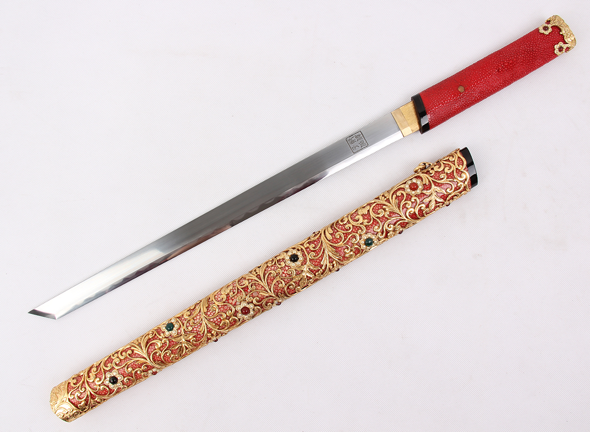 全長:69CM 刃長:47CM 柄長:20CM 劍身: 高碳鋼覆土燒刃刀鞘:紅色鯊魚皮裝具:銅鍍金鑲寶石包裝:錦盒