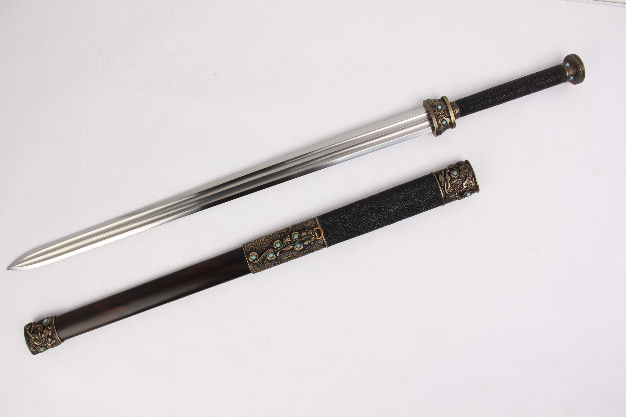 全長:92CM 刃長:65CM 柄長:24CM 劍身: 百煉花紋鋼刀鞘:黑檀木 黑色鯊魚皮裝具:銅包裝:木錦盒