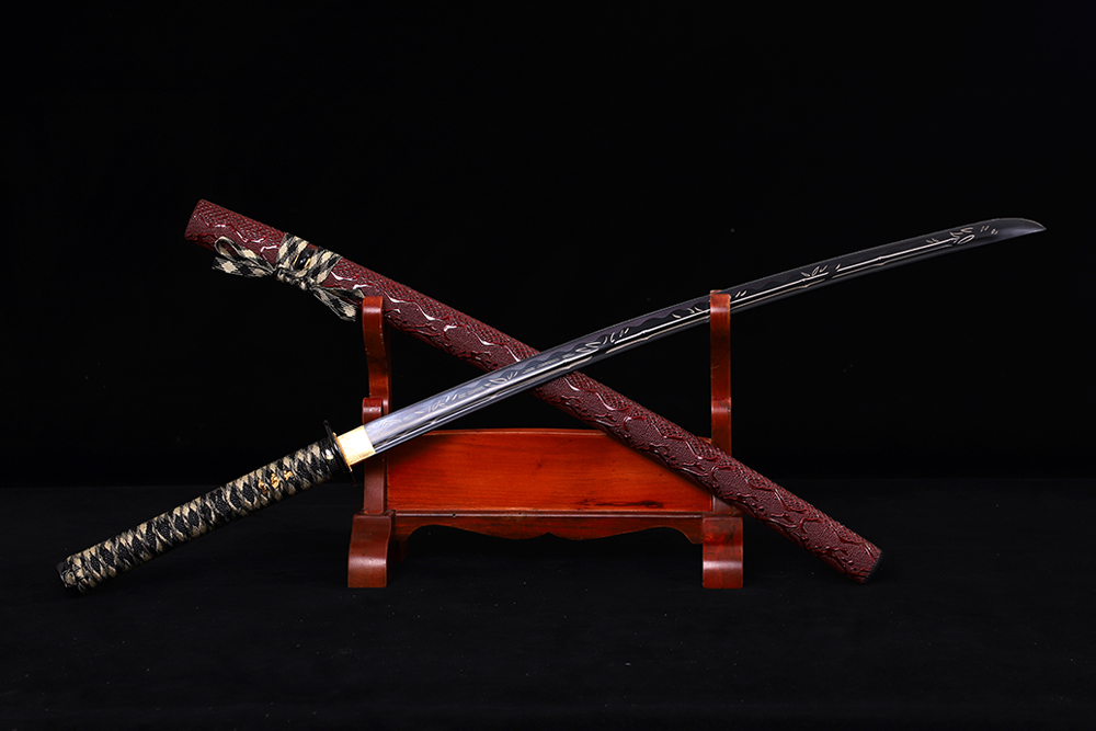 28寸手工刀全長:104cm 刃長:68cm 柄長:28cm刃材:1045鋼發(fā)黑全槽有花口有切線 激光刻竹柄材:實木 繞黃加黑帶+仿魚皮鞘材:實木包仿暗紅色蟒蛇皮 繞黃加黑帶配件:鋅合金包裝:雙瓦紙盒 帶黑布袋
