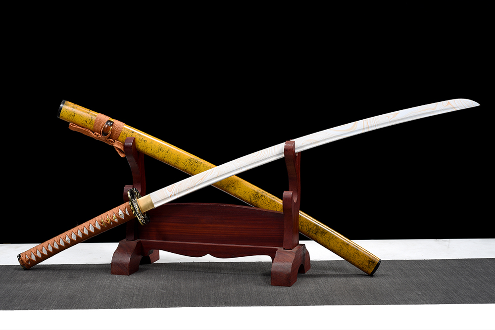 28寸手工刀全長(zhǎng):104cm 刃長(zhǎng):68cm 柄長(zhǎng):28cm刃材:1045鋼有槽 白色木紋油漆柄材:實(shí)木 繞橙黃帶+仿魚(yú)皮鞘材:實(shí)木黃底拉黑絲水晶鼻 繞橙黃帶配件:銅+鋅合金包裝:雙瓦紙盒 帶黑布袋
